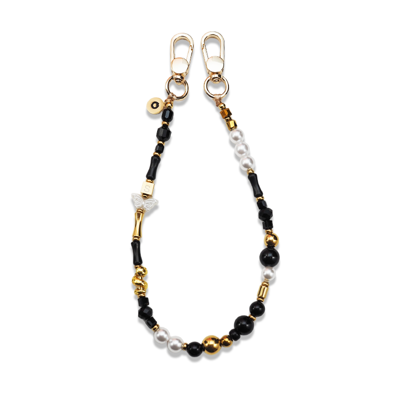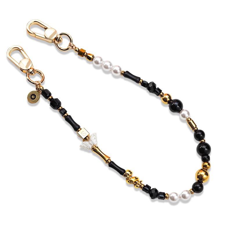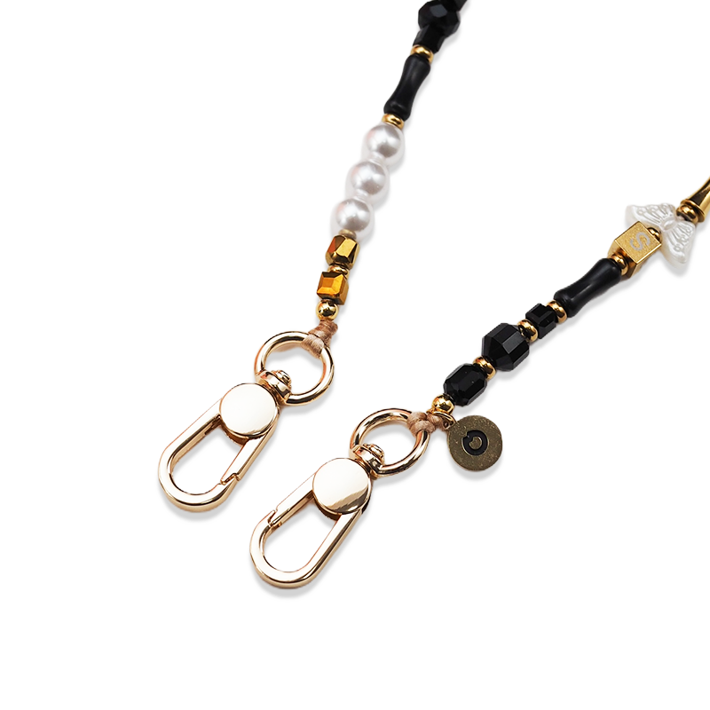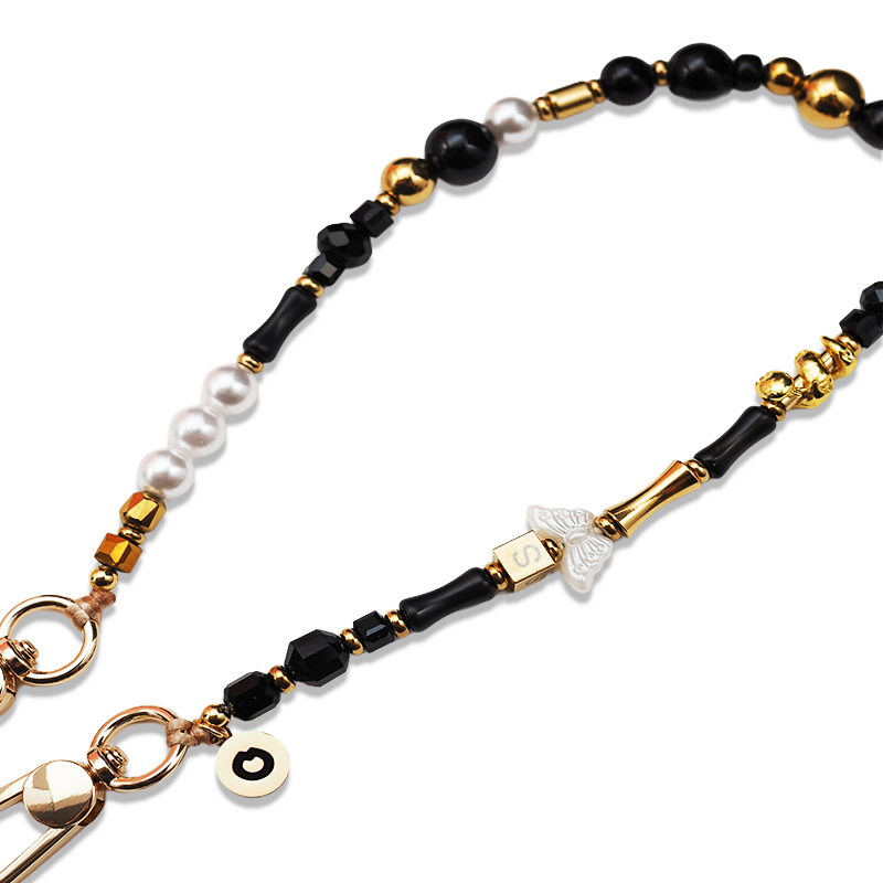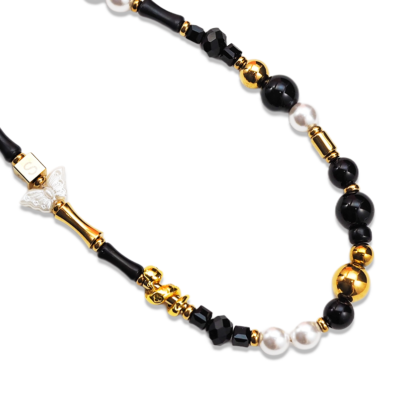 المادة: حجر طبيعي معالج، كريستال اصطناعي، عقيق أسود، لؤلؤ من راتنج ABS، فولاذ مقاوم للصدأ، سبيكة زنك مطلي بالذهب 18 قيراط، بوليستر